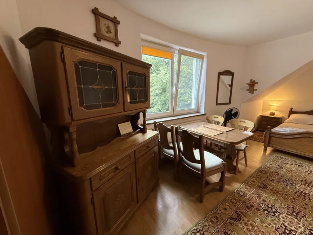 Pokój na pierwszym piętrze z poddaszem. Trzy łóżka 90x200, kanapa 140x200, aneks kuchenny, wentylator. Widok na zieleń.